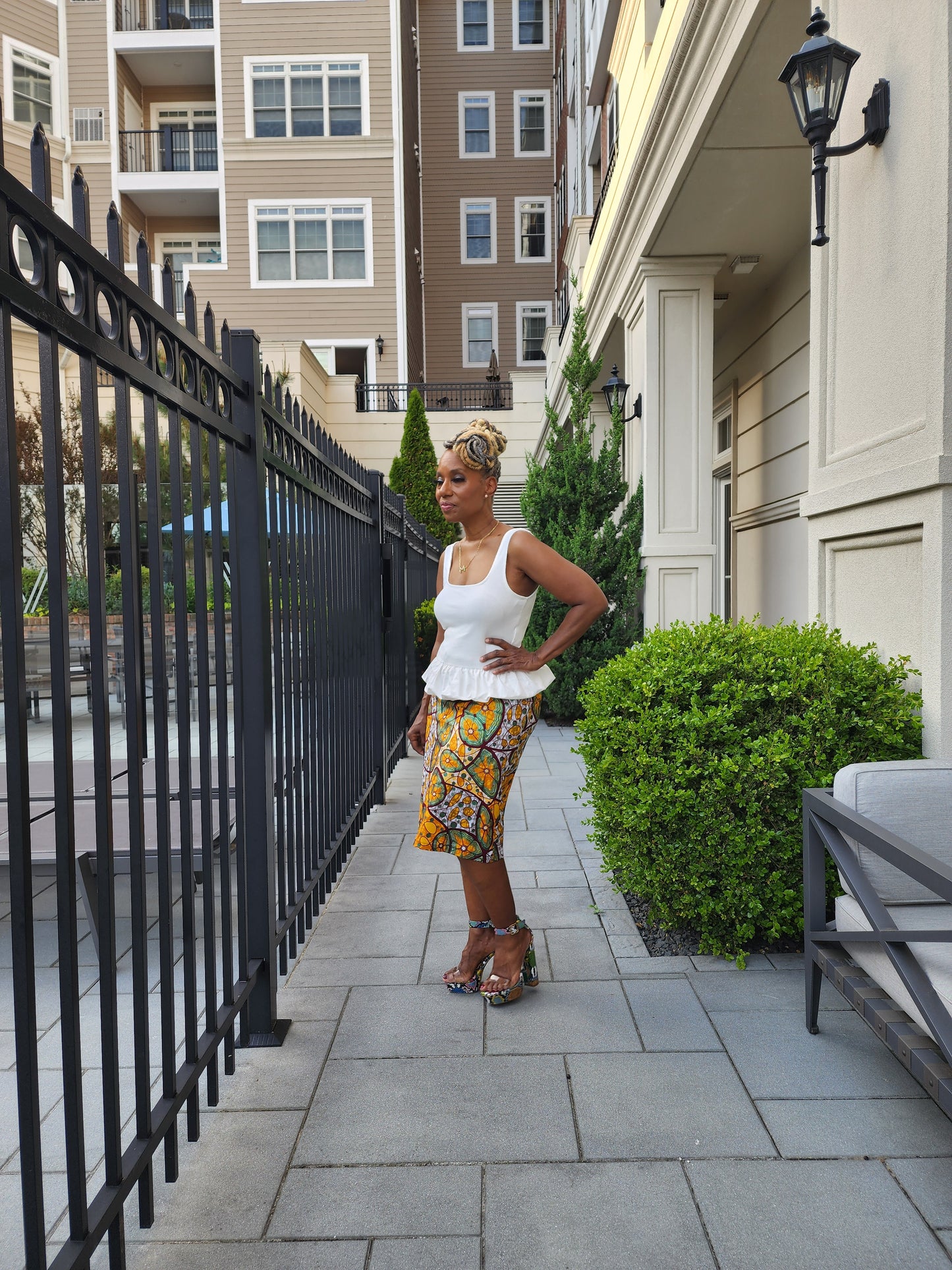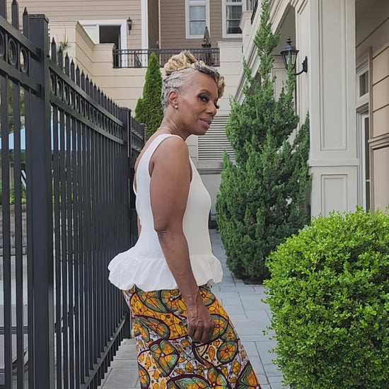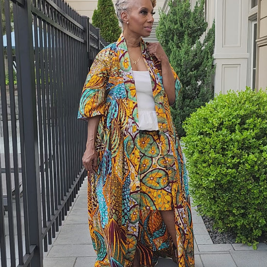 Dani African Print skirt is a chic draw string skirt with side pockets with a ribbon tie, Fitted and feminine it is the perfect under pairing for the Harusi Kimono shown with it (sold separately)
